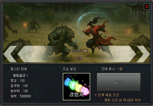 ½É·Ã 4´Ü°è ¸ó½ºÅÍ Á¦ÇÑ ½Ã°£(1ºÐ 30ÃÊ) ³» 50¸¶¸® óġ |