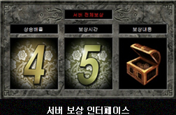 | ¼¹ö º¸»óÀº ÇØ´ç ¼¹ö Àüü Àοø¿¡°Ô Àû¿ëµÇ´Â º¸»óÀ¸·Î ÀüÅõ½Ã°£ Á¾·á ÈÄ º°µµ ÀÎÅÍÆäÀ̽º¸¦ ÅëÇØ È®ÀÎÇÒ ¼ö ÀÖ½À´Ï´Ù. ¼¹ö º¸»óÀº ¹èÀ², ½Ã°£, Á¾·ù·Î ºÐ·ù µÇ¸ç °¢°¢ ·£´ýÇÏ°Ô ¼±ÅÃµÇ¾î º¸»ó °á°ú°¡ È®Á¤µÇ¸é ¼¹ö °øÁö¿Í ÇÔ²² º¸»óÀÌ ÁøÇà µË´Ï´Ù. | ||||||||