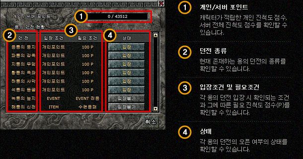 | - ³«¾ç¼ºÀÇ ¼Ò¸²Àå¹® NPC¿¡°Ô¼ [¿ëÀÇ ´øÀü ÀÔÀå] ¸Þ´º¸¦ ÅëÇØ ¿ëÀÇ ´øÀü ÇöȲÀ» È®ÀÎÇϰí ij¸¯ÅÍ ¸íÈ£¿¡ ¸Â´Â ¿ëÀÇ ´øÀüÀ» ¼±ÅÃÇÏ¿© ÀÔÀåÇÕ´Ï´Ù. - °¢ ´øÀü¿¡ µû¶ó Á¤ÇØÁø ¸íÈ£ÀÇ Ä³¸¯Å͸¸ ÀÔÀå °¡´ÉÇϸç, ÀÔÀå ½Ã °³ÀÎ ÁøÃ´µµ Á¡¼ö°¡ ¼Ò¸ðµË´Ï´Ù. |